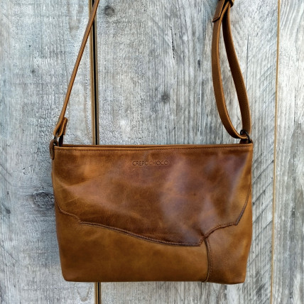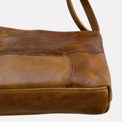 Un patchwork de cuir marron ciré pour un look vintage et authentique, la créatrice fait le choix d'utiliser toute la peau avec ces aspérités, ce qui confère à chaque pièce un caractère unique.