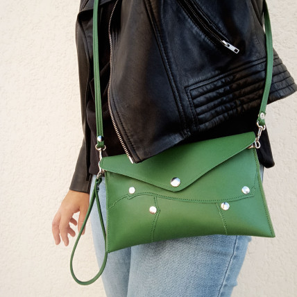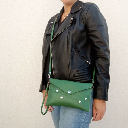 Cette pochette en cuir de créateur se porte à la main ou en bandoulière. Idéale pour toutes les saisons, de jour comme de nuit, la pochette est un accessoire pratique, dans laquelle vous pouvez y glisser tous vos indispensables. La créatrice a choisit un patchwork de cuir clouté pour un look tendance & rock !