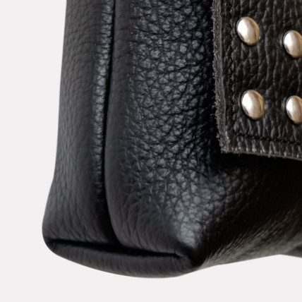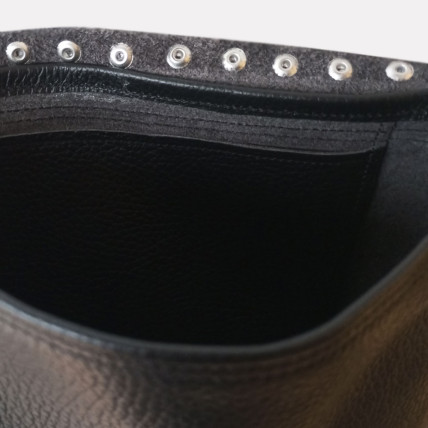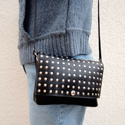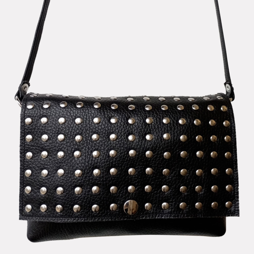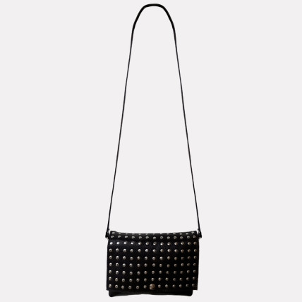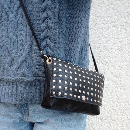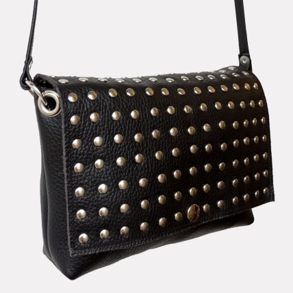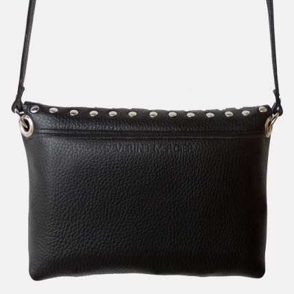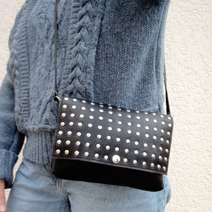 Cette pochette en cuir de créateur se porte en bandoulière. Idéale pour toutes les saisons, de jour comme de nuit, la pochette est un accessoire pratique, dans laquelle vous pouvez y glisser tous vos indispensables. La créatrice a choisit un cuir de vachette grainé noir clouté pour un look tendance et rock !
