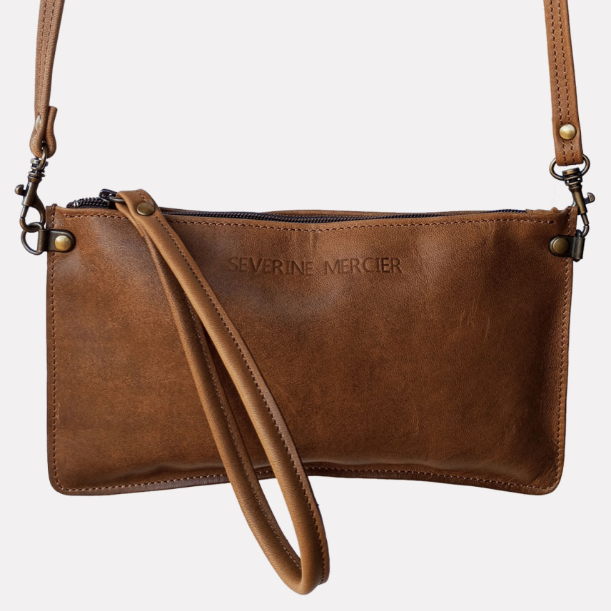 De petite taille, elle reste légère et peu encombrante, idéale pour en soirée ou pour un évènement. Le sac à main étant parfois de trop, vous pouvez aisément emporter avec vous votre pochette PRECIEUX SEVERINEMERCIER.COM, qui contient vos essentiels. La pochette en cuir, réalisée avec un cuir de vache marron ciré (tannerie française), se ferme grâce à une fermeture à glissière en nylon. La bandoulière est amovilbe grâce à l'utilisation de mousquetons et vous permet de l'utiliser dans le sac, à la main, à l'épaule ou en bandoulière.