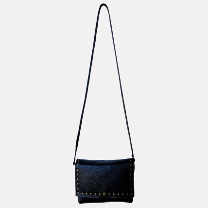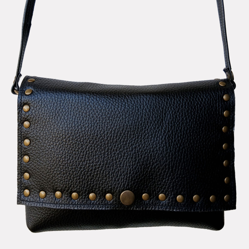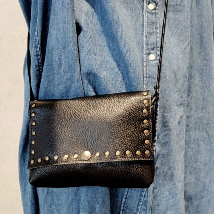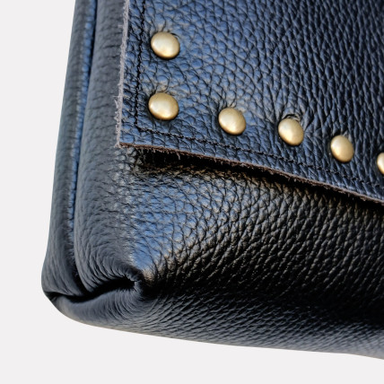 Cette pochette en cuir de créateur se porte en bandoulière. Idéale pour toutes les saisons, de jour comme de nuit, la pochette est un accessoire pratique, dans laquelle vous pouvez y glisser tous vos indispensables. La créatrice a choisit un cuir de vachette grainé clouté laiton vieilli pour un look tendance et rock !